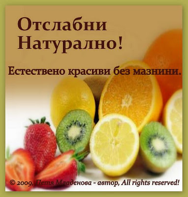 otslabni_naturalnoСписанията са препълнени с красиви и стройни хора, но и с "рецепти за храни, от които човек дебелее". За "Oтслабване" са изписани с астрономически цифри количества от книги, статии, мнения, съвети и какви ли не още лунни диети, поучаващи ни за натурално отслабване, НО КРАТКОТРАЙНО. Моля за разумно внимание към това което следва..., защото в него се крие голата истина, от която зависи не само вашето здраве, но и НАТУРАЛНОТО ВИ ОТСЛАБВАНЕ ЗАВИНАГИ!